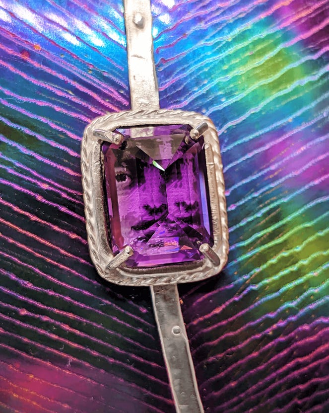 A massive 44.75-carat Brazilian amethyst crowns the decorative pin portion of the fibula, supported by two smaller natural blue Cambodian zircons positioned at the terminals of the fibula’s ring. The gemstones weave Avra’Am’s historical approach into a contemporary framework. The color references royalty and high priesthood, especially in the context of ancient Mediterranean cultures, where purple-dyed cloth from the murex shell was a marker of divine or imperial status. In this piece, that symbolism elevates the full breadth of Jewish Algerian culture— its aesthetics, rituals, language, and historical depth. I am an inheritor and custodian of that wealth.