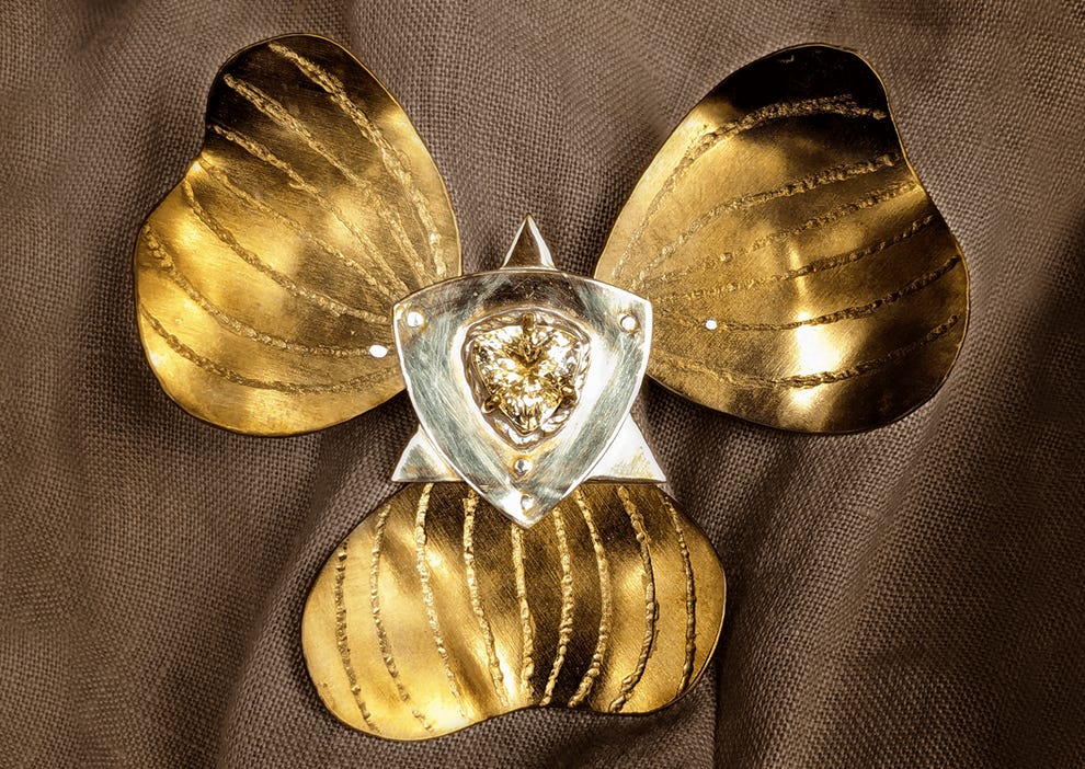 Aleph reclaims the yellow badge imposed by oppressive sumptuary laws— from dhimmitude to Nazi Germany— and transforms it into a floral shield. Forged in brass, titanium, silver, and heliodor, it is a defiant emblem against the lust for Jewish death.