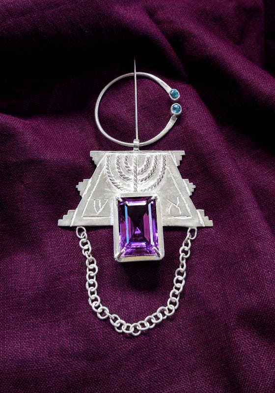 A twisted silver wire Menorah anchors the design, a symbol that predates the Star of David and speaks to our unity, endurance, and Temple devotion that bound us to the land. The Menorah, once a symbol of shattered sovereignty under Rome, is reclaimed here as it is in the emblem of modern Israel. A decorative chain links one side of the fibula to the other, referencing the traditionally paired North African use of such objects as garment fasteners worn on the left and right shoulders. Often, these fibulae would be adorned with talismanic silver beads symbolizing fertility and abundance suspended by chains.