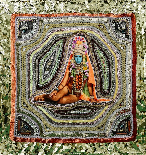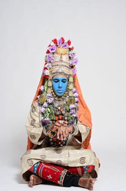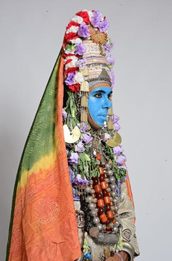 After her death, the bride’s clothes are passed down through the women of the family and they wear them on their henna day. Out of longing to wear the wedding clothes that my grandmother embroidered, I wear the family wedding clothes and wear the family gargush. The embroidery work surrounding the photo is a tribute to the embroidery pieces that my grandmother created, in the center of which she placed family photos, framed and given as a gift or hung in her living room.